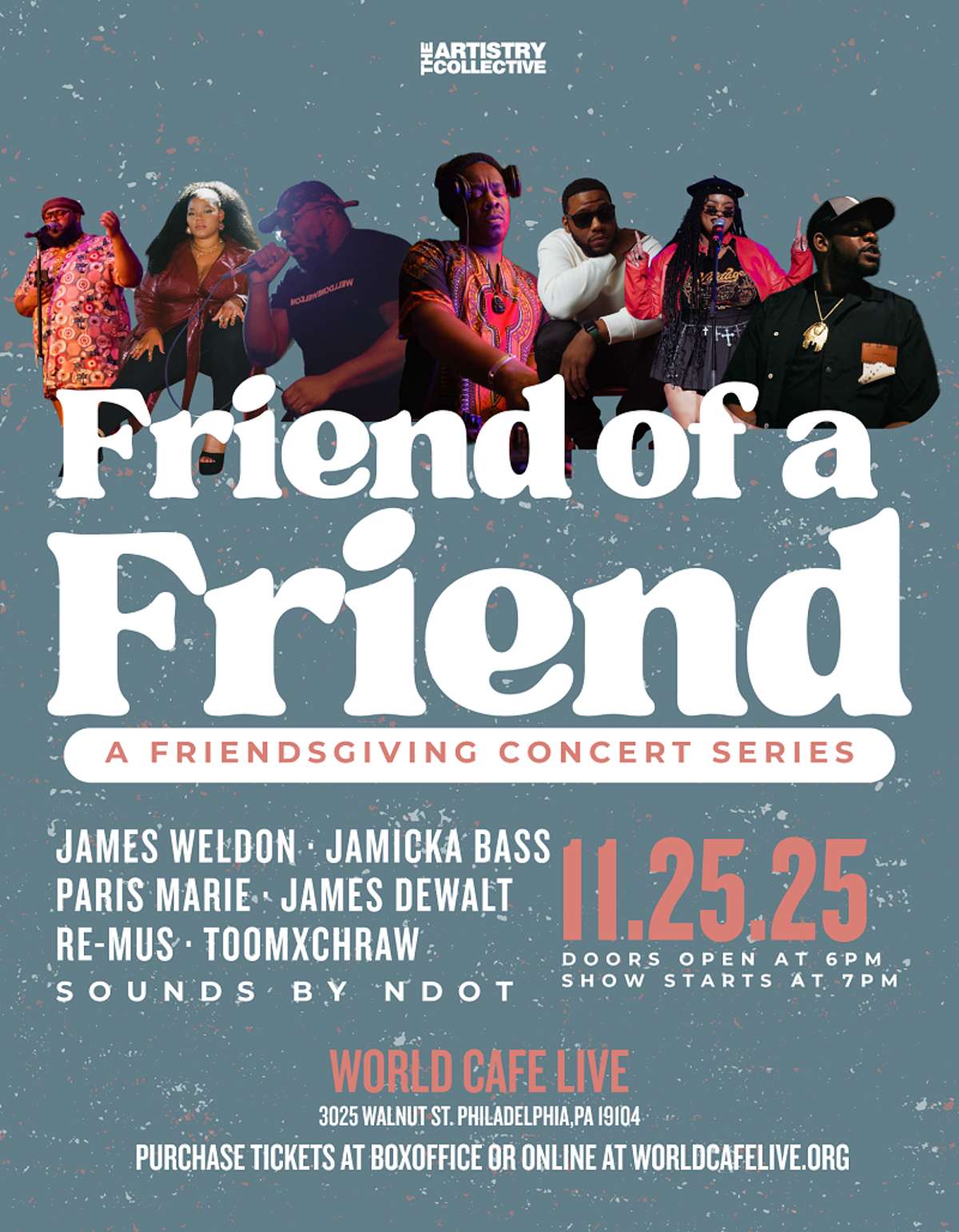 Join us for an unforgettable night of Hip Hop, R&B, and community as The Artistry Collective presents Friend of a Friend: A Friendsgiving Concert Series. This is a celebration of music, friendship, and gratitude. Experience live performances from some of Philadelphia’s most talented artists including James Weldon, Jamicka Bass, Paris Marie, James Dewalt, Re-Mus, and TooMxchRaw, with sounds curated by NDOT.