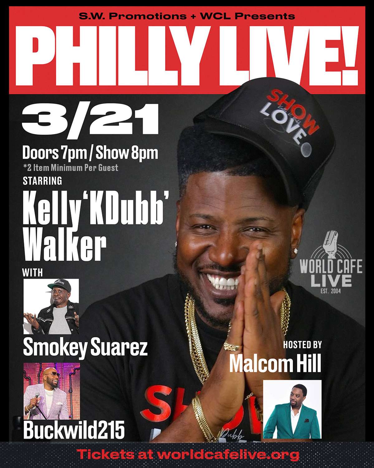 Full show lineup: Buckwild215, Smokey Suarez & Kelly “KDubb” Walker hosted by Comedian Malcolm Hill.
